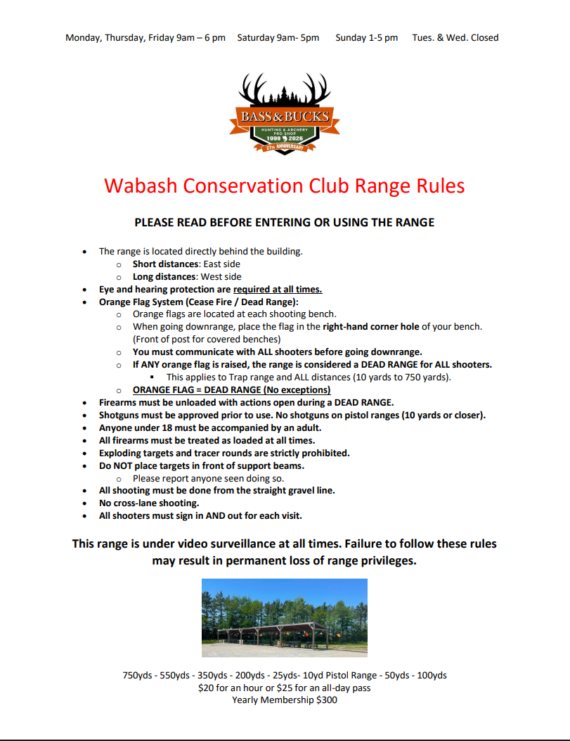 The Wabash Conservation Club's gun range is located on-site, offering targets up to 750 yards. Covered shooting benches are available at 350 yards, 550 yards, and 750 yards. The range is open during daylight hours when our shop is open, year-round.